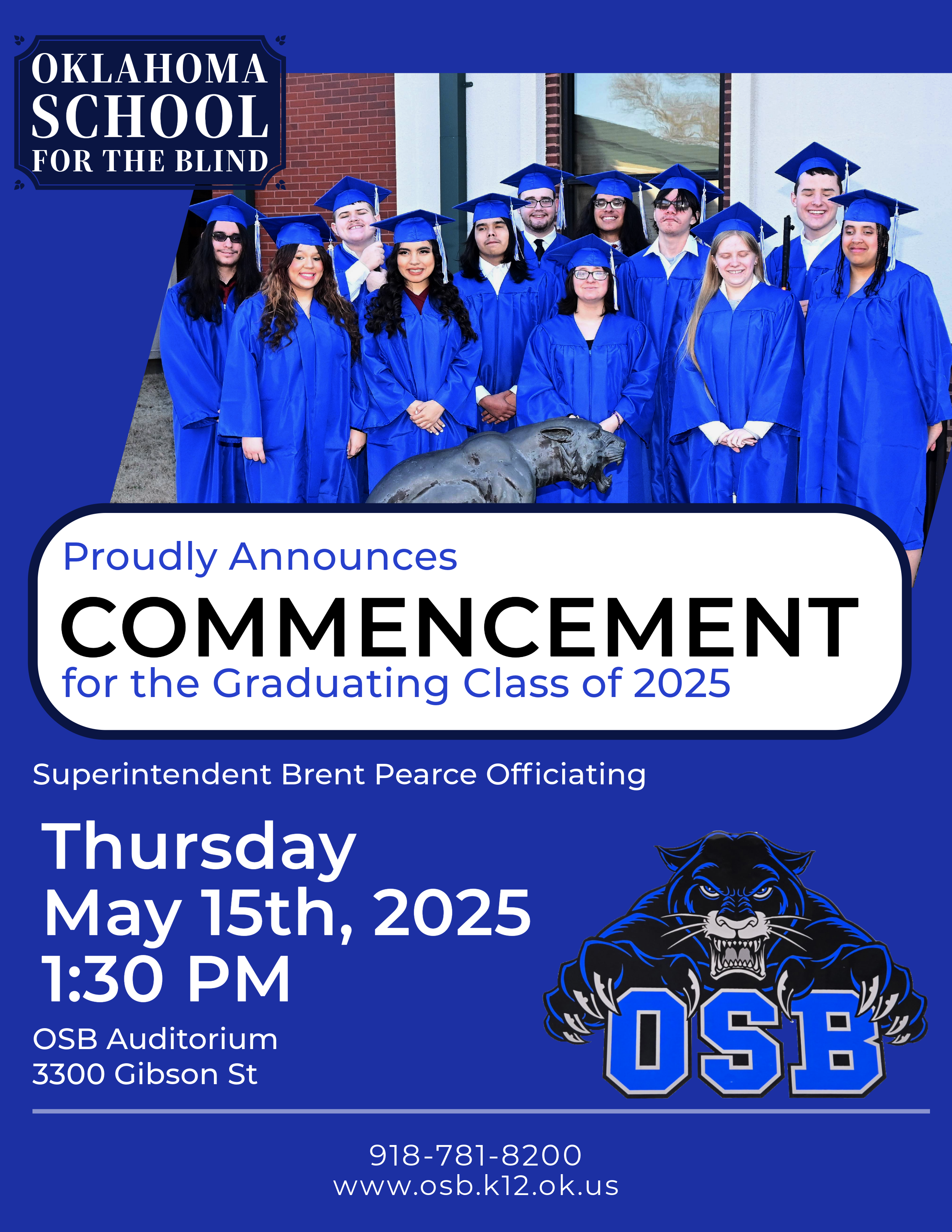 Located in Muskogee, the Oklahoma School for the Blind (OSB) provides residential and day education, and outreach programs at no charge for Oklahoma children who are blind or visually impaired from infancy through 12th grade. OSB's goal is to help students reach their maximum potential.